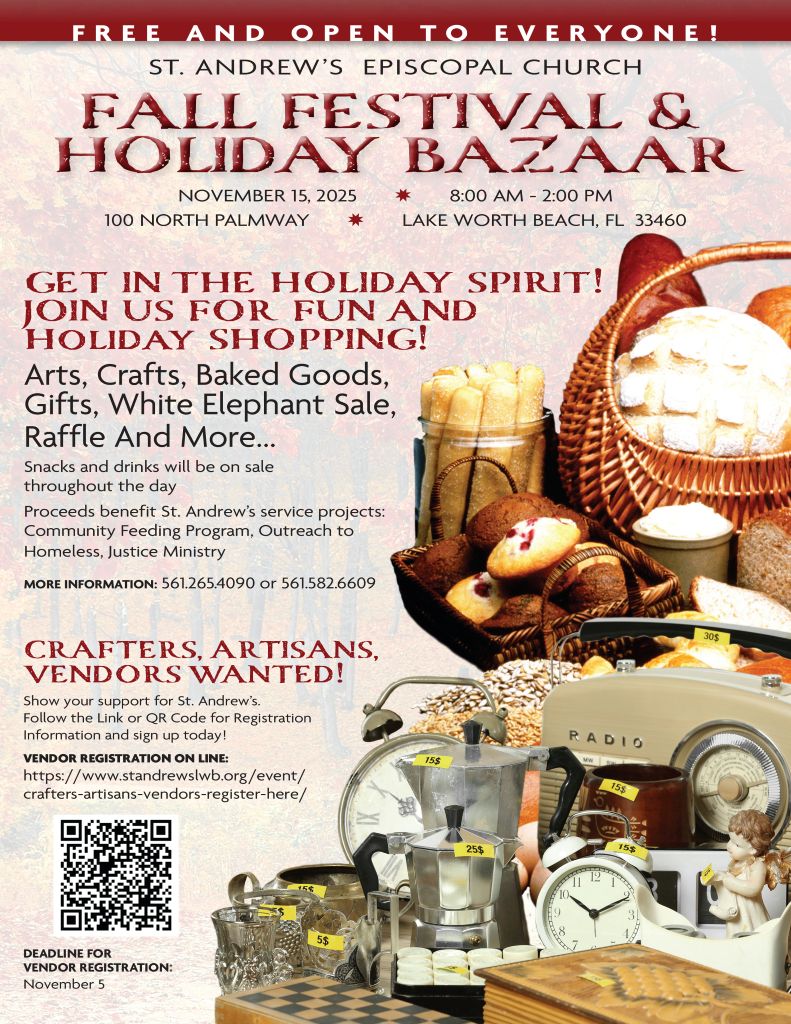 Join us for St. Andrew’s Fall Festival and Bazaar on Saturday, November 15th from 8:00 am to 2:00 pm. It’s Free and open to the public. All are Welcome!!